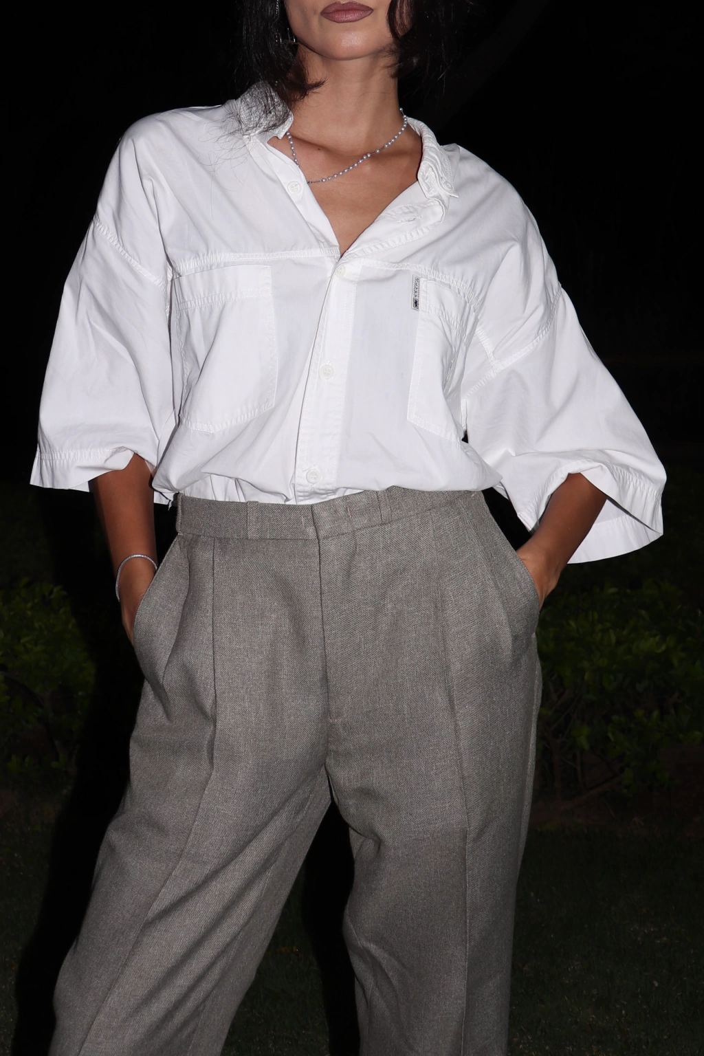 Calça em alfaiataria mesclado com pregas frontais. Tecido macio, encorpado y confortável.