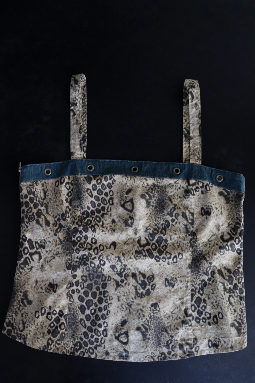 Blusa em estampa de animal print com detalhe jeans com ilhós na parte superior y zíper lateral. Tecido 68% algodão 29% poliester 3% elastano.