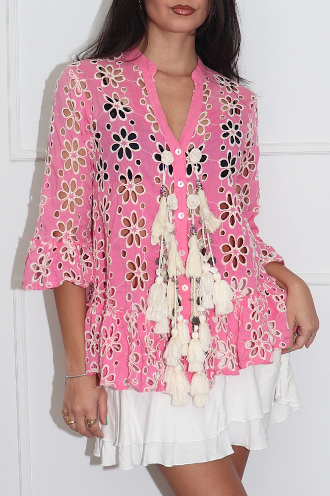 Blusa riquisima inteira em detalhes impecáveis: flores vazadas em bordado em toda peça; pingentes de tecido y franja com pequenas miçangas y conchinha (pode ser removido/adicionado) & crochê na parte posterior. Feito na India. Tecido 100% algodão.