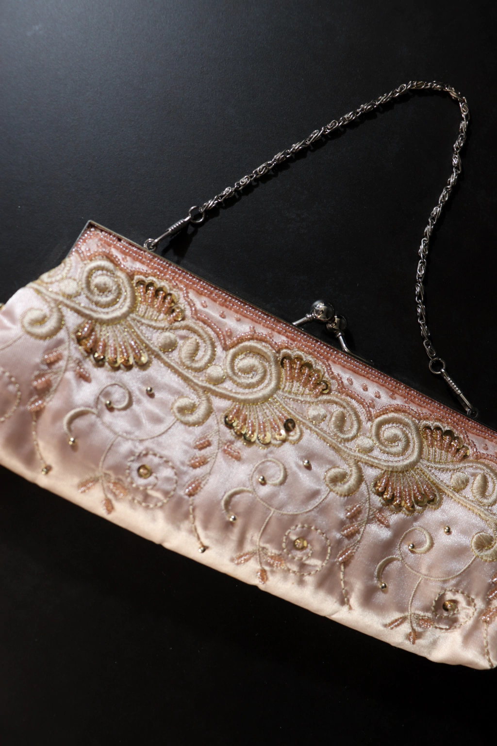 Bolsa de mão em rosé com ricos detalhes de bordado com lantejoulas y miçangas. Possui adaptador para alça maior - não acompanha alça. Cabe celular y más. Possui leves marcas de tempo na parte prateada; não visível/não impossibilita durante o uso.