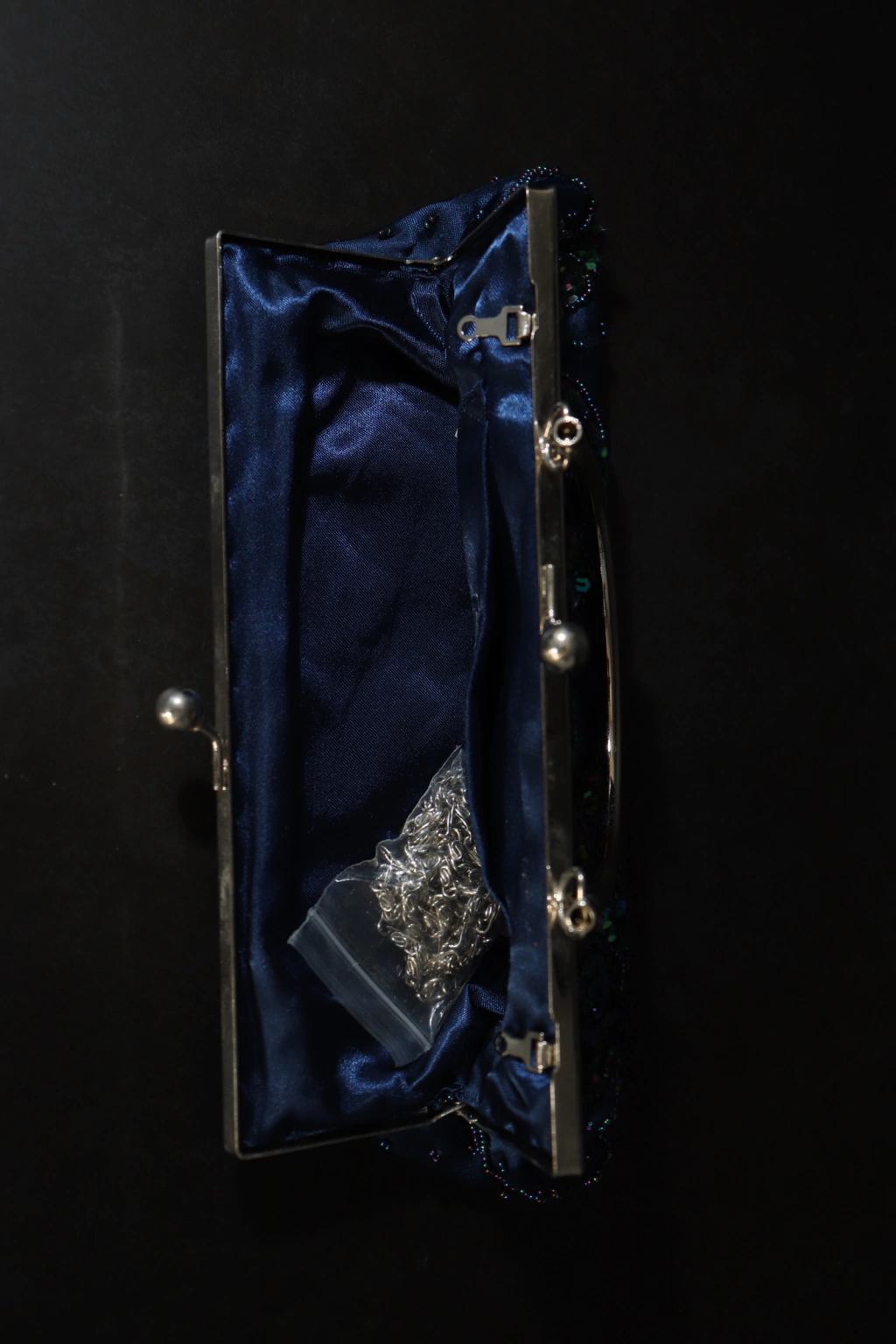 Bolsa azul com lantejuolas y miçangas em azul, verde y turquesa com detalhes prateados. Acompanha alça maior. Nova, na etiqueta (marcando o ano de 2008). Cabe celular y más. Possui leves marcas de tempo na parte prateada; não visível/não impossibilita durante o uso.