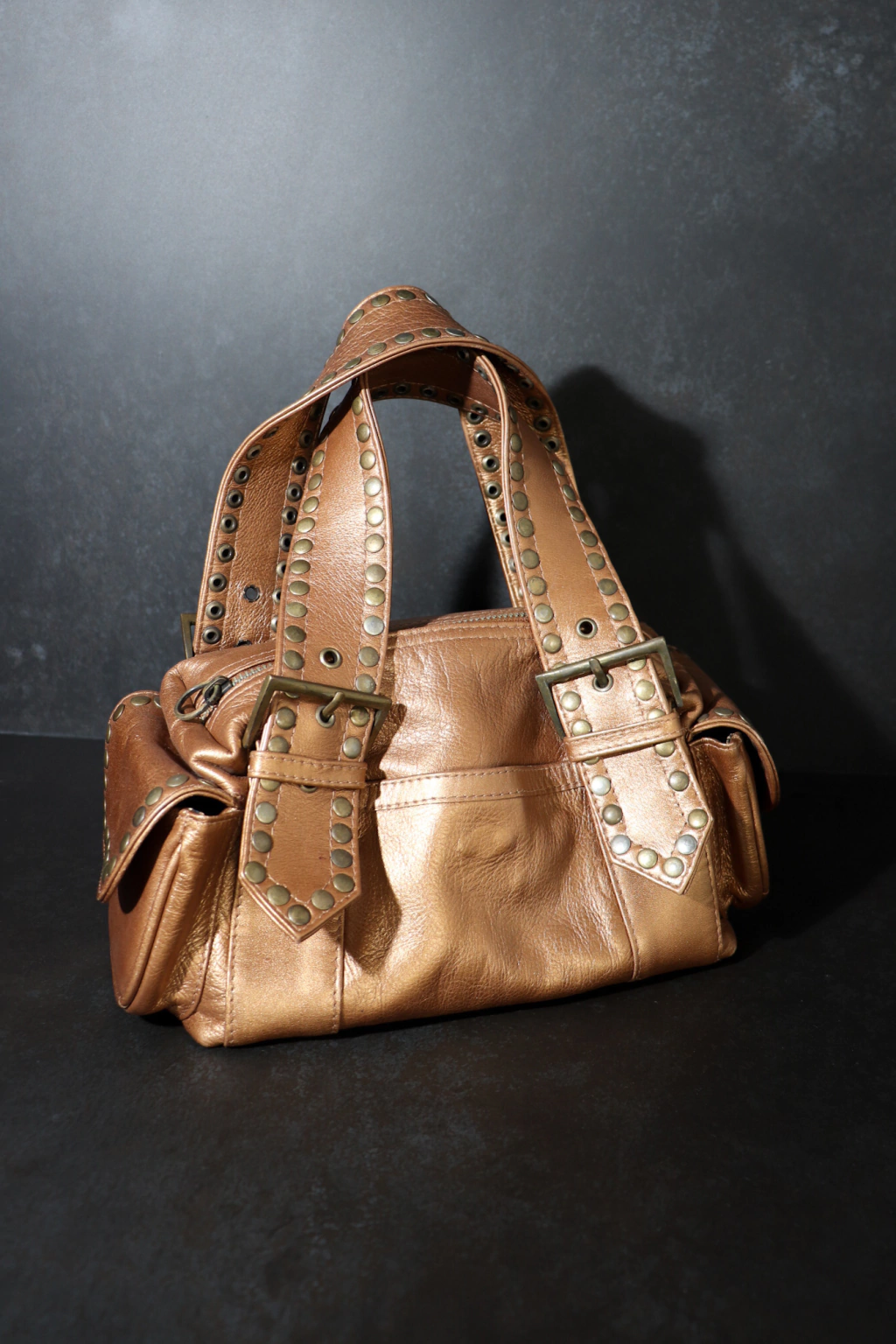 Bolsa de mão dourada com detalhes de diversas tarraxas. Espaçosa, possui bolsos externos laterais, frontal y na parte de trás acrescida de animal print no interior. Tecido couro na etiqueta. Algumas tarraxas possui o tom prateado, vide fotos. Não impossibilita o uso.