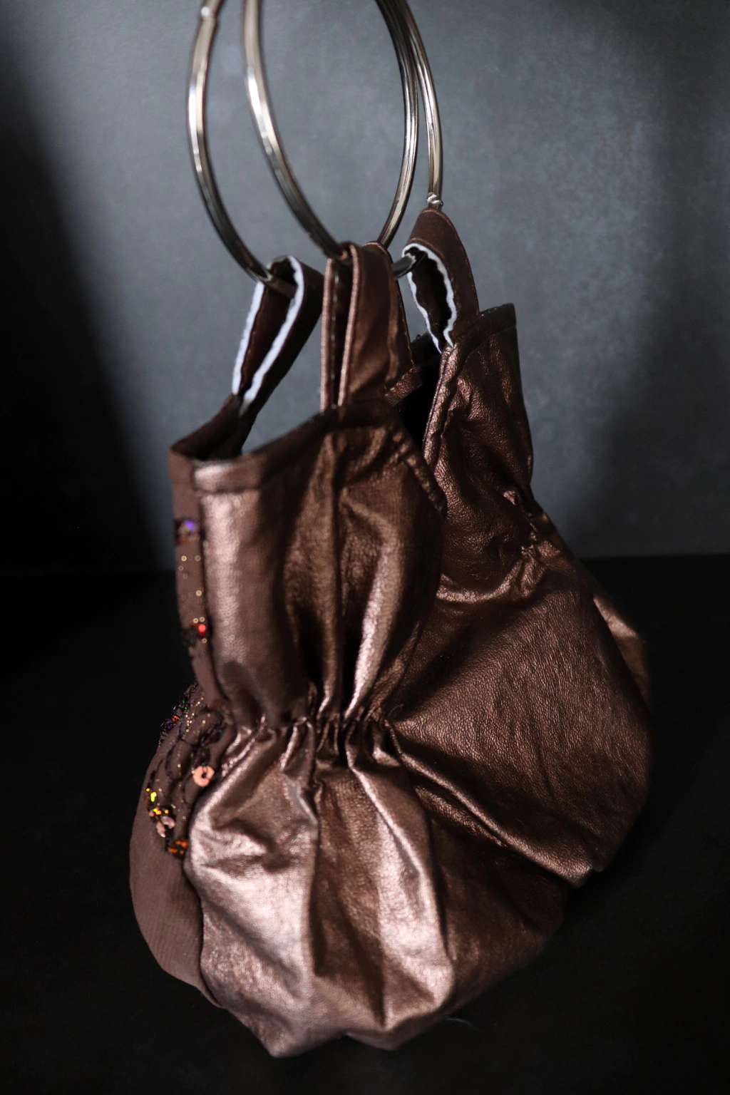 Bolsa de mão com lantejoulas marrons y detalhe de linhas bordadas.