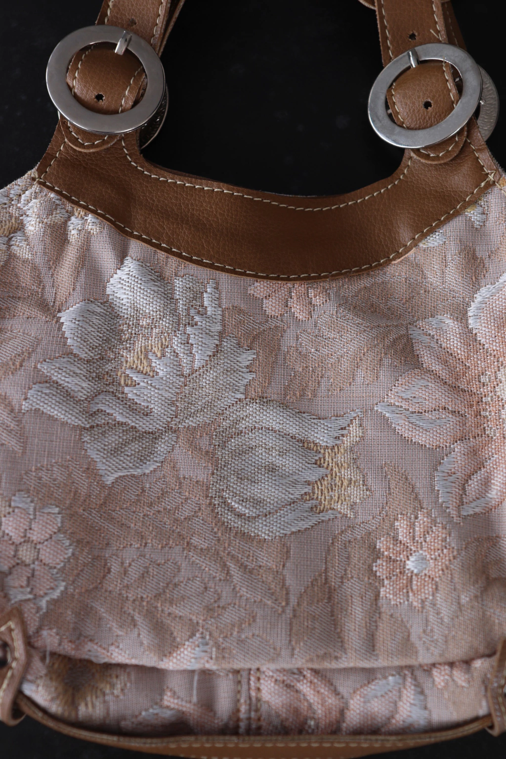 Bolsa Mini Vintage com estampa de flores em canutilho y lantejoulas mais detalhe de fivelas.