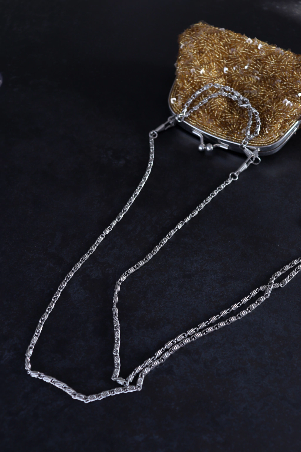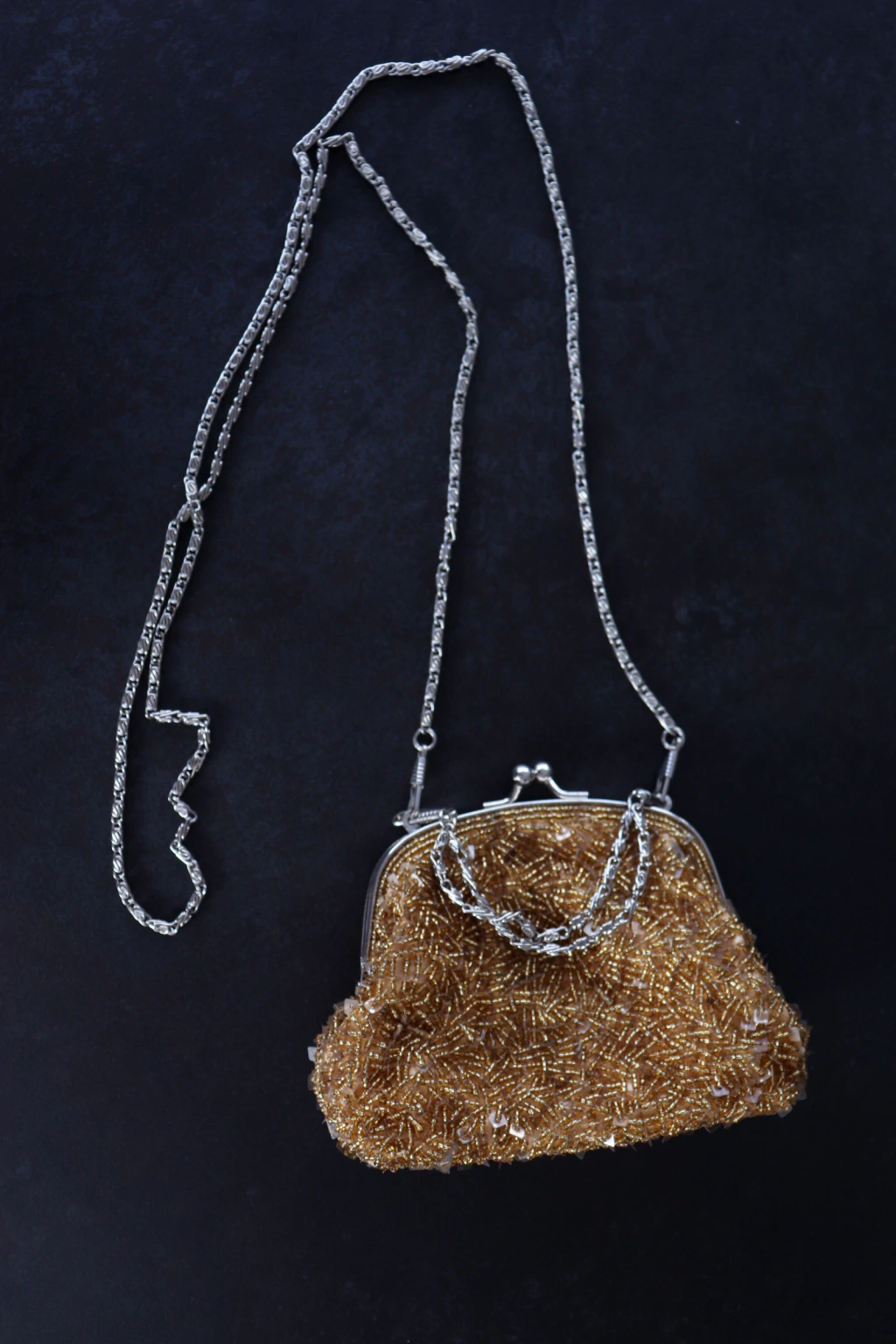 Bolsa de ombro ou de mão, com duas correntes/alças para usar como preferir. Rica em detalhes de miçangas, em perfeito estado.