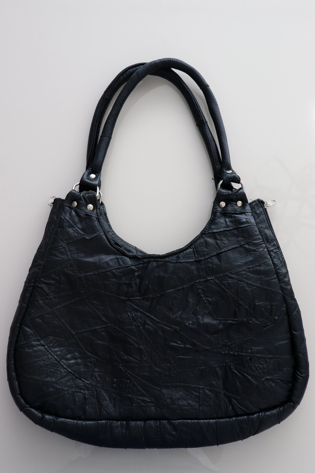 Bolsa preta com imitação de retalhos de couro, porém de material que não esfarela com courofake. Espaçosa, possui zíperes laterais y bolso na parte posterior.