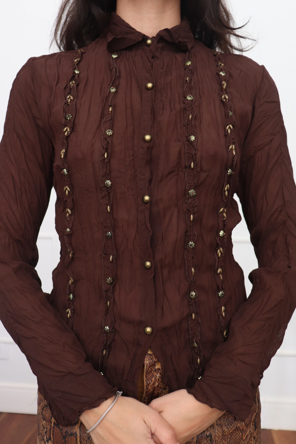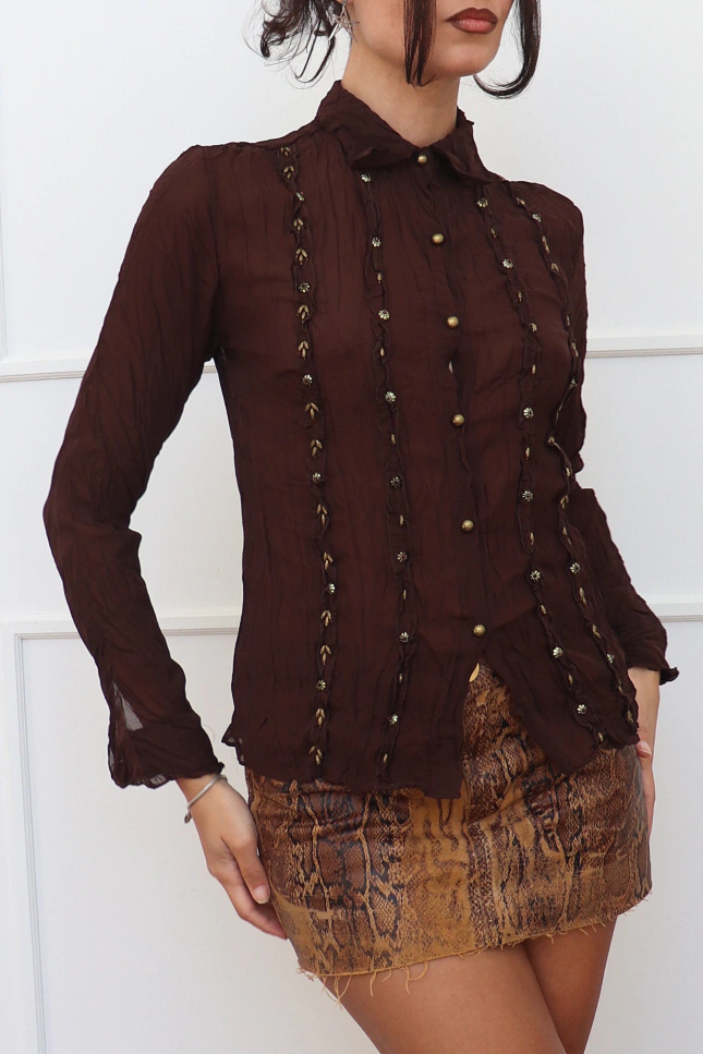 Camisa texturizada com detalhes ricos de miçangas y botões em tom de ouro envelhecido. Tecido 100% poliester.