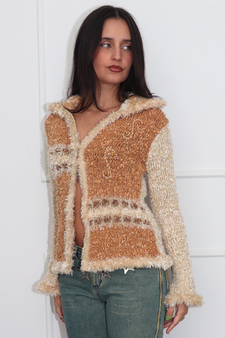 Casaco com tecido trançado, de detalhes em pelos y alguns adereços marrons. Possui manga sino y zíper duplo - que possibilita diferentes formas de estilismo. Não é forrado ou extremamente quente, ótimo para meia estação. Tecido 70% acrilico 30% lã.