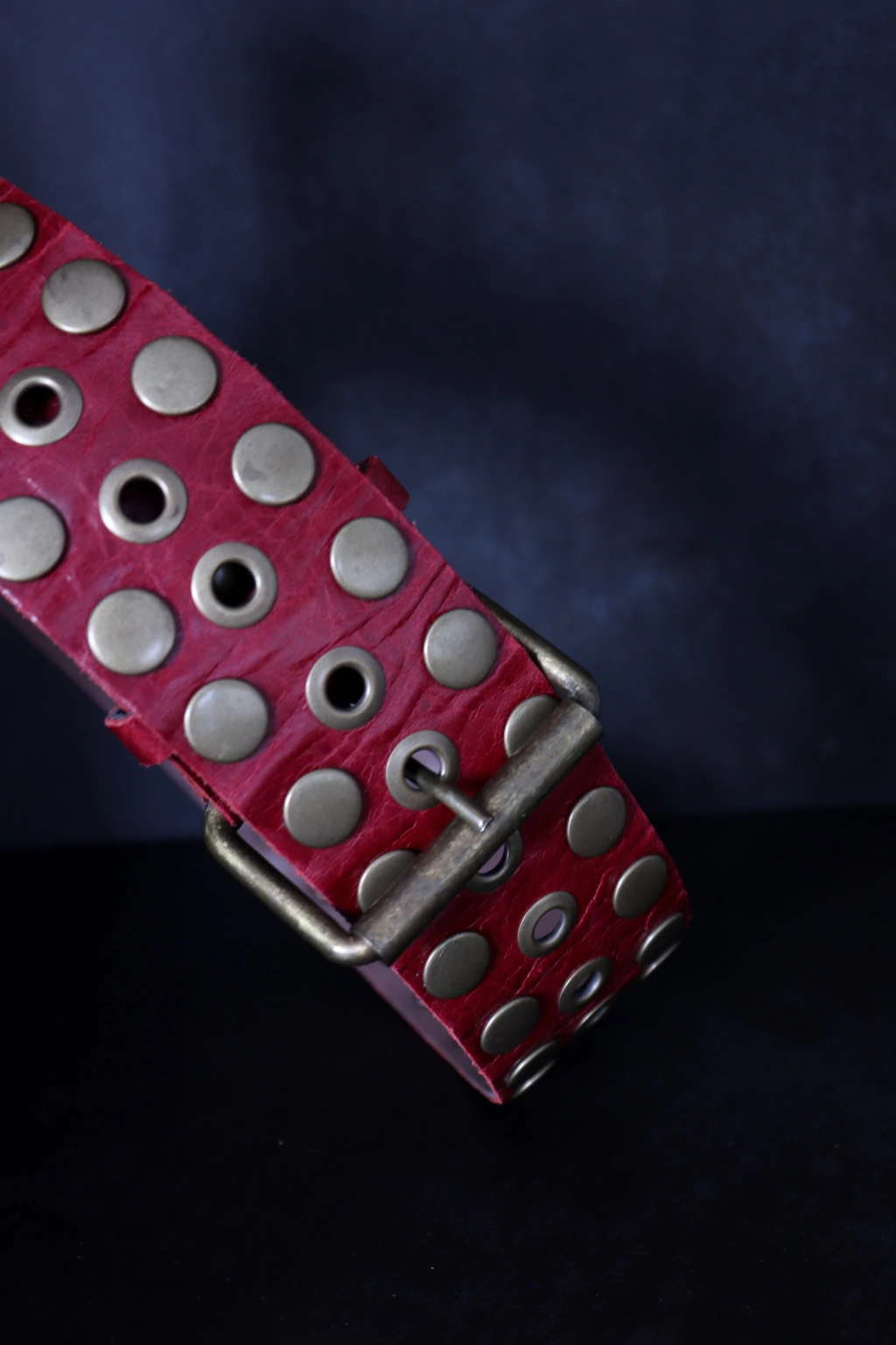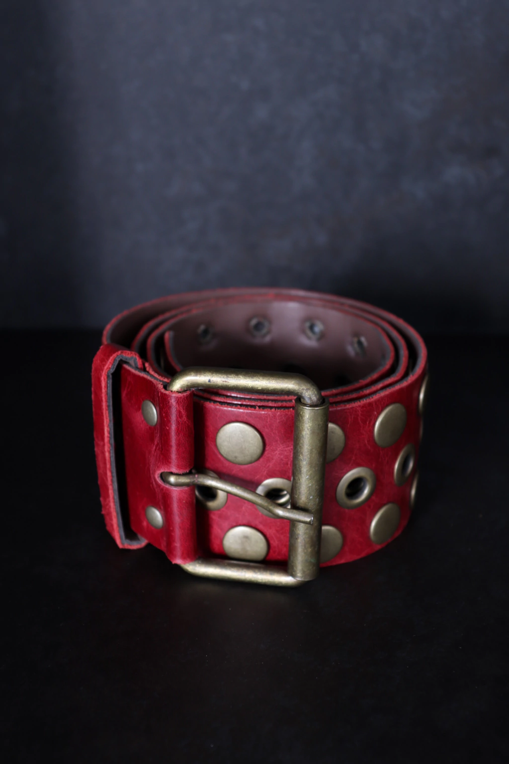 Cinto grosso em couro vermelho com ilhós em cobre.
