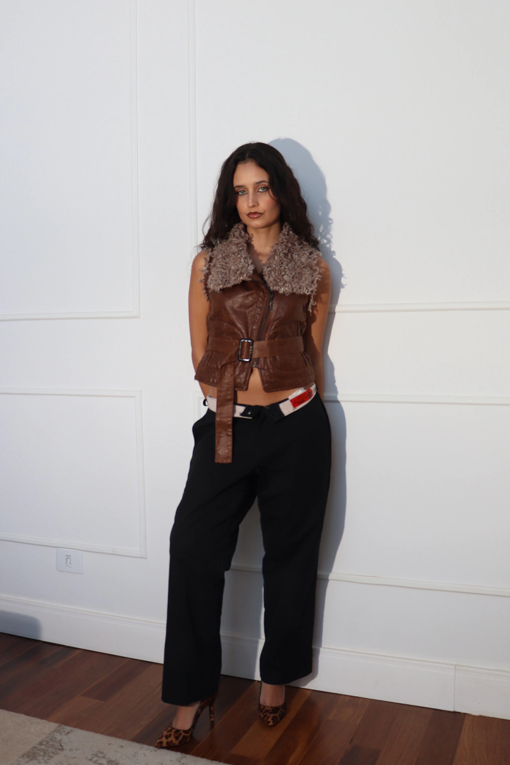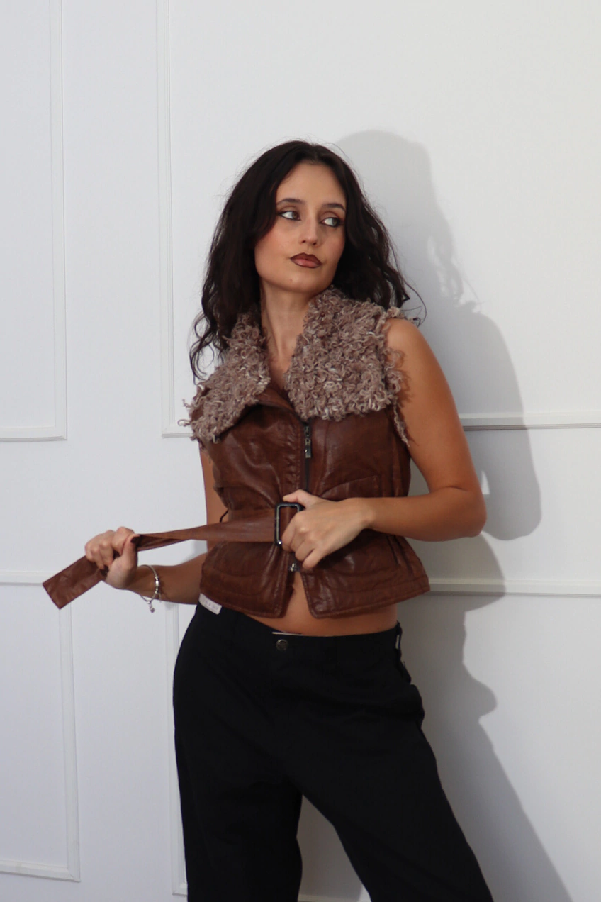 Colete marrom com super gola de pelucia y detalhe de cinto para acinturar. Parte interna em fleece. Tecido externo 100% poliuretano. Interno 100% poliester. Tecido não é do tipo que descasca.