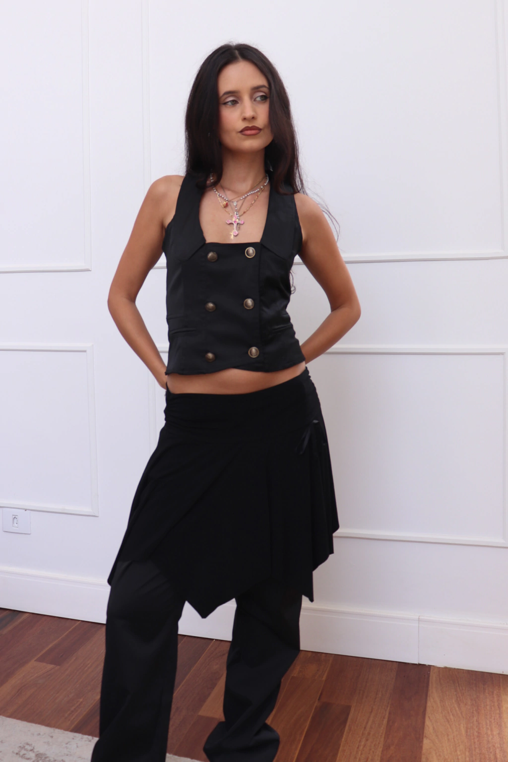 Colete preto com botões. Tecido 66% algodão 30% poliester 4% elastano. Ajustado para produção das fotos.